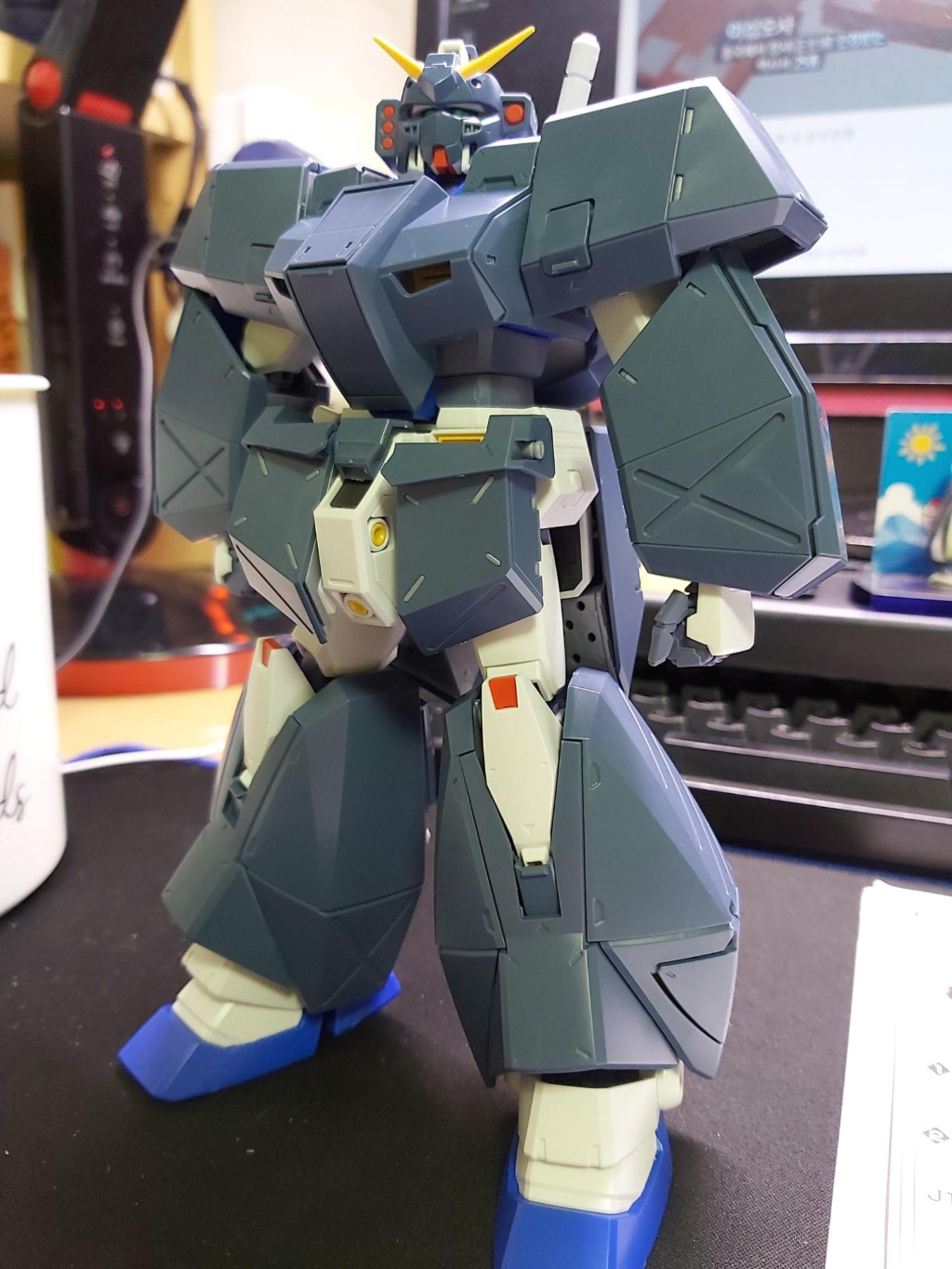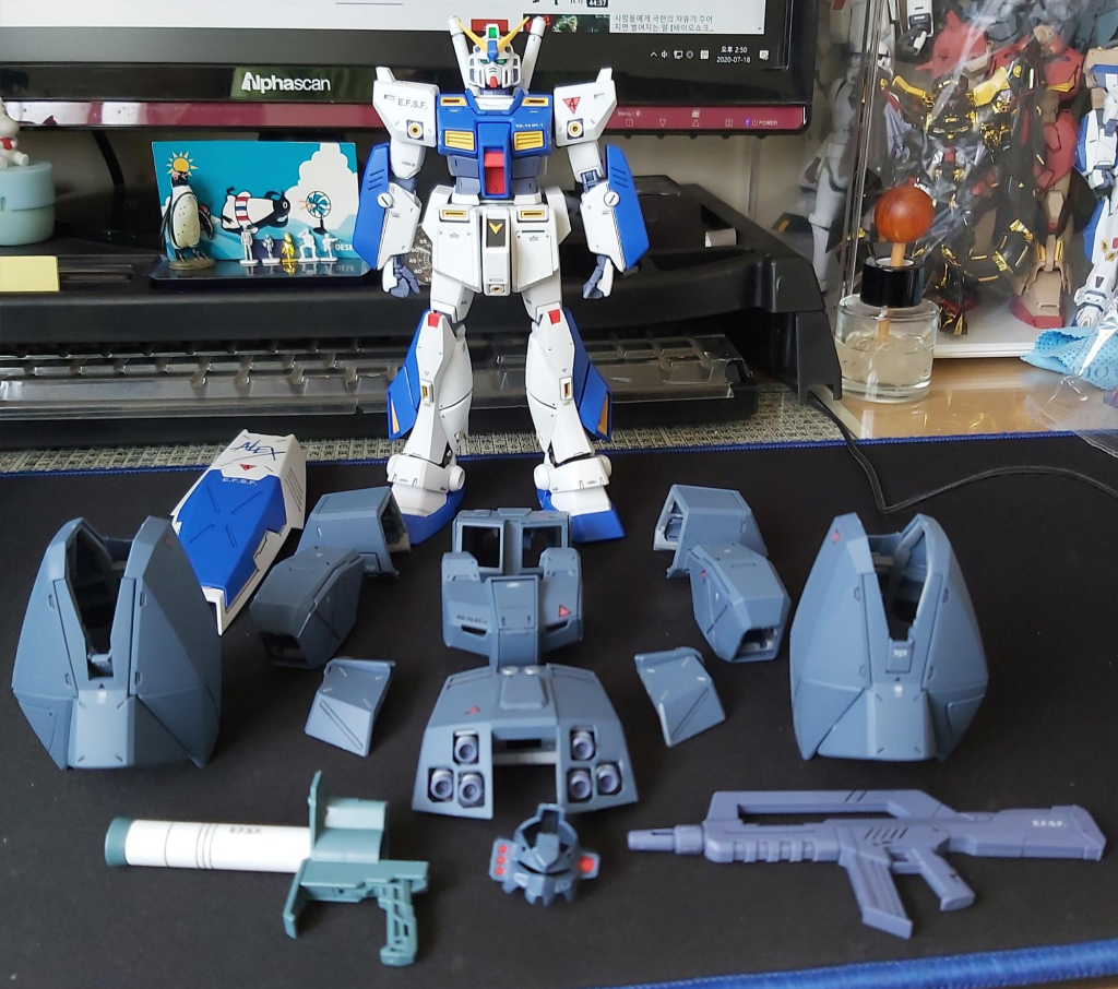 만들고 나니 건담F90과 색이나 디자인이 비슷한 느낌을 받았습니다. 이야기를 들어보니 F90이 나올 때가 알렉스 나올 때와 비슷해서 그 디자인 등을 많이 따라했다고 합니다.